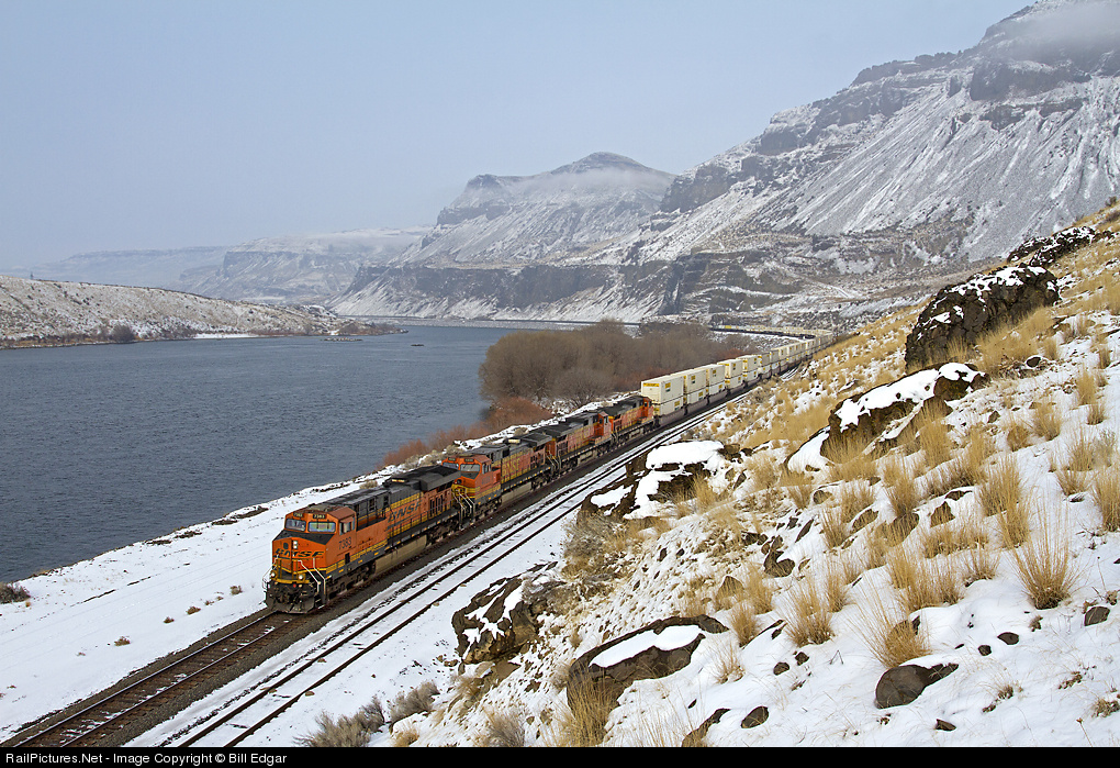 | A BNSF South Seattle-Chicago intermodal cruises along the Columbia River after its crew change in Wenatchee about 15 miles west of this location. It had met a late running Empire Builder at Malaga and will soon stop at Quincy, WA to pick up double stacks of perishables before continuing on to Spokane. |