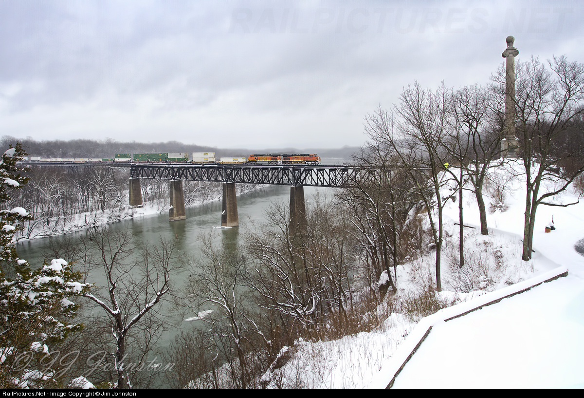 A pair of BNSF engines lead the NS intermodal over the Potomac River from Maryland into West Virginia following a significant Mid-Atlantic snowstorm.