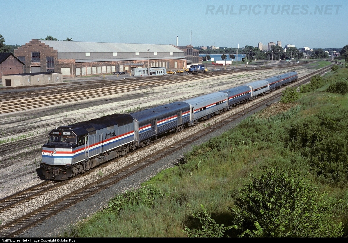 Amtrak's westbound train #351, the Wolverine, is shown passing the former Michigan Central locomotive and car shop buildings at Jackson, MI. Built in 1872, the shops built and repaired equipment for the MC (later absorbed by the New York Central) until closed by NYC in June, 1949. Although locomotive and car repair had been moved to other locations, the yard remained in operation during the Penn Central and into the Conrail years. As can be seen in the photo, by the early 1990's, most activity had ceased.
