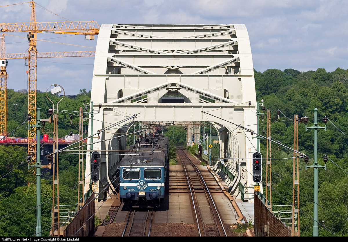 | A commuter train passes the Årsta bridge and enters central Stockholm from the south. A few years later a second bridge will double the capacity here, the building of the bridge is in full swing and can be seen to the left. |