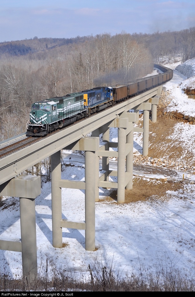 A pair of SD70MAC's heads south over the new bridge as they climb Muldraugh Hill with empties from LG&E's Cane Run Generating Station. The second unit, PAL 4522, is one of the few remaining MAC's yet to receive a new coat of green.