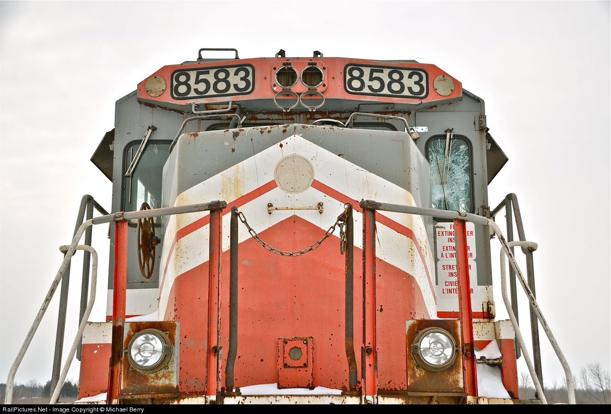 The vandals have been busy. MMA 8583 (as well as 9 cars behind it) have been stranded on MMA's Stanbridge Sub since last summer. The reason for this is the poor condition of the track, which led to Transport Canada embargoing the line, and also led to a car derailing slightly further north, thus cutting off the only way this train could be moved by rail. Vandals have not left this venerable GE unit untouched, as is evident from this photo. For photos of this engine from last fall, click here and here. For more train photos, click here.