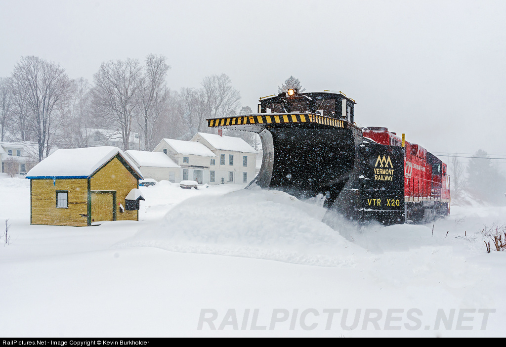| A Valentine's Day plow extra was operated over the Vermont Rail System's Green Mountain Railroad Bellows Falls Subdivision to clear the most recent snow accumulation that ranged from 20-30 inches. CLP GP38 203 and the 101-year-old ex-Canadian Pacific plow, VTR X-20, move heavy snowfall as the plow extra passes the old East Wallingford sectionhouse that had recently been moved to an open field adjacent the tracks by the land owner. The X-20 was built in September of 1912 by the Angus Shops for CPR as CP 401030. The plow was sold to the VTR off the Quebec Central Railway in 1971 and was originally just the VTR 20, before being renumbered to X-20 after 1976. |