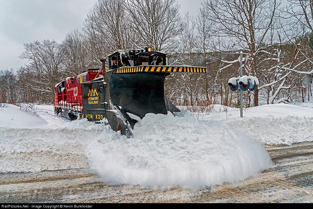 A Valentine's Day plow extra was operated over the Vermont Rail System's Green Mountain Railroad Bellows Falls Subdivision to clear the most recent snow accumulation that ranged from 20-30 inches. CLP GP38 203 and the 101-year-old ex-Canadian Pacific plow, VTR X-20, push a large amount of snow onto a country road as the train heads or Bellows Falls. The X-20 was built in September of 1912 by the Angus Shops for CPR as CP 401030. The plow was sold to the VTR off the Quebec Central Railway in 1971 and was originally just the VTR 20, before being renumbered to X-20 after 1976.