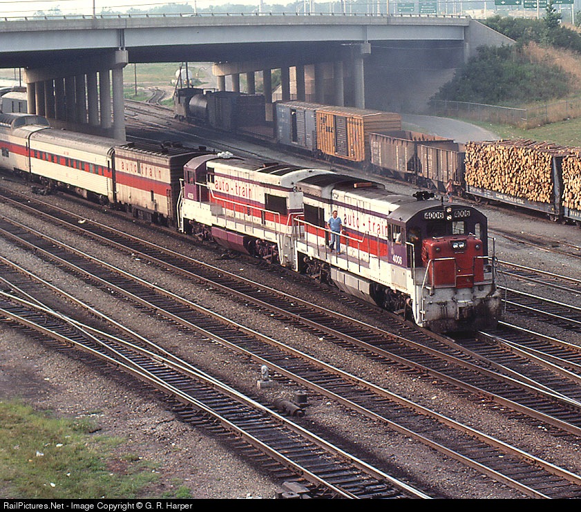 | The original Auto-Train, led by U36B #4006, passes through RF&P's Acca Yard in Richmond, VA. |