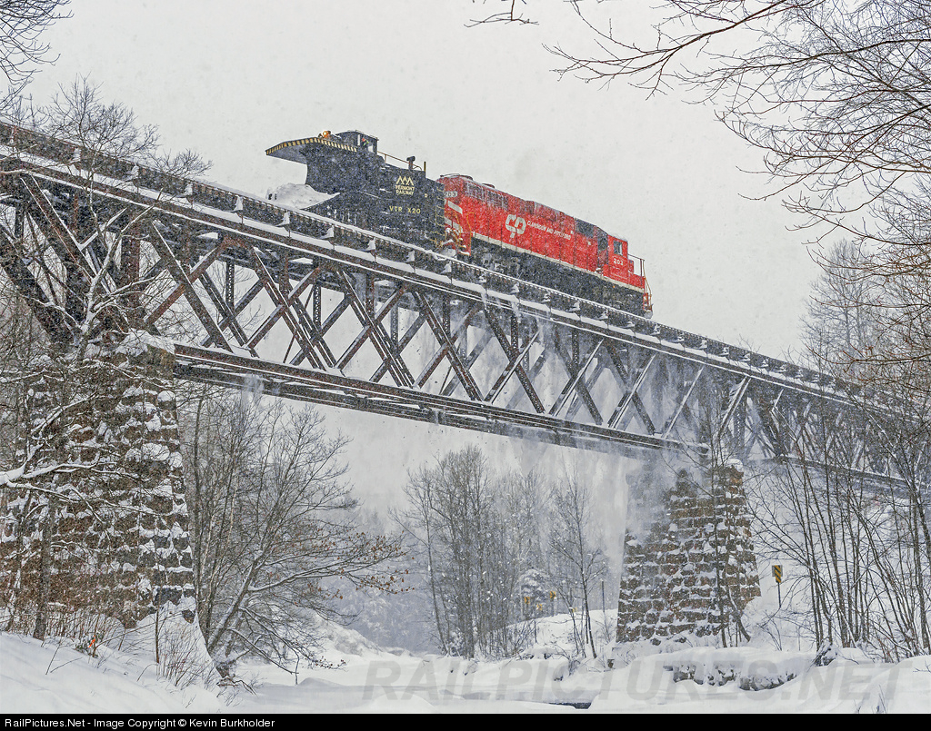 | A Valentine's Day plow extra was operated over the Vermont Rail System's Green Mountain Railroad Bellows Falls Subdivision to clear the most recent snow accumulation that ranged from 20-30 inches. CLP GP38 203 was in charge of pushing the 101-year-old ex-Canadian Pacific plow, VTR X-20. The X-20 was built in September of 1912 by the Angus Shops for CPR as CP 401030. The plow was sold to the VTR off the Quebec Central Railway in 1971 and was originally just the VTR 20, before being renumbered to X-20 after 1976. The plow extra is seen crossing Cuttingsville Trestle amid driving heavy and blowing snow early Friday morning. |