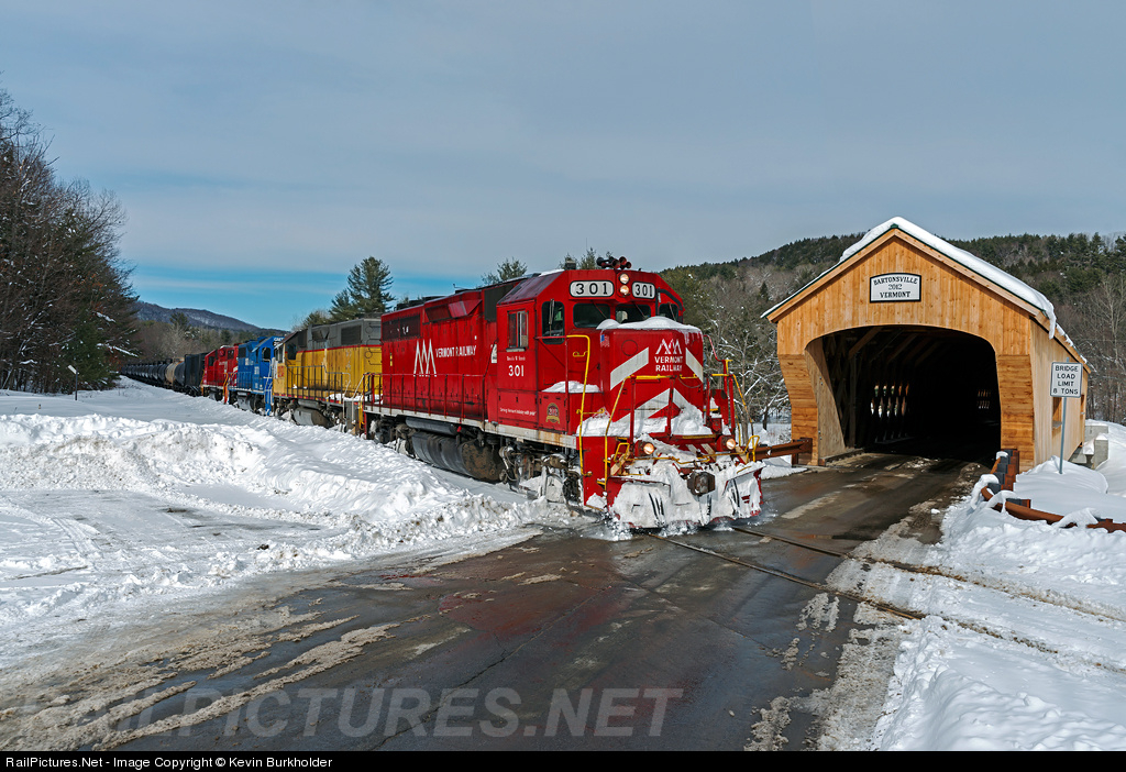 Another colorful Vermont Rail System consist is seen passing the Bartonsville covered bridge on February 16, as VTR GP40 301, LLPX GP38-2 2334, GMTX GP38-2 2663, and CLP GP38 203 lead the head 41 cars of the 644-002 ethanol train toward Bellows Falls.