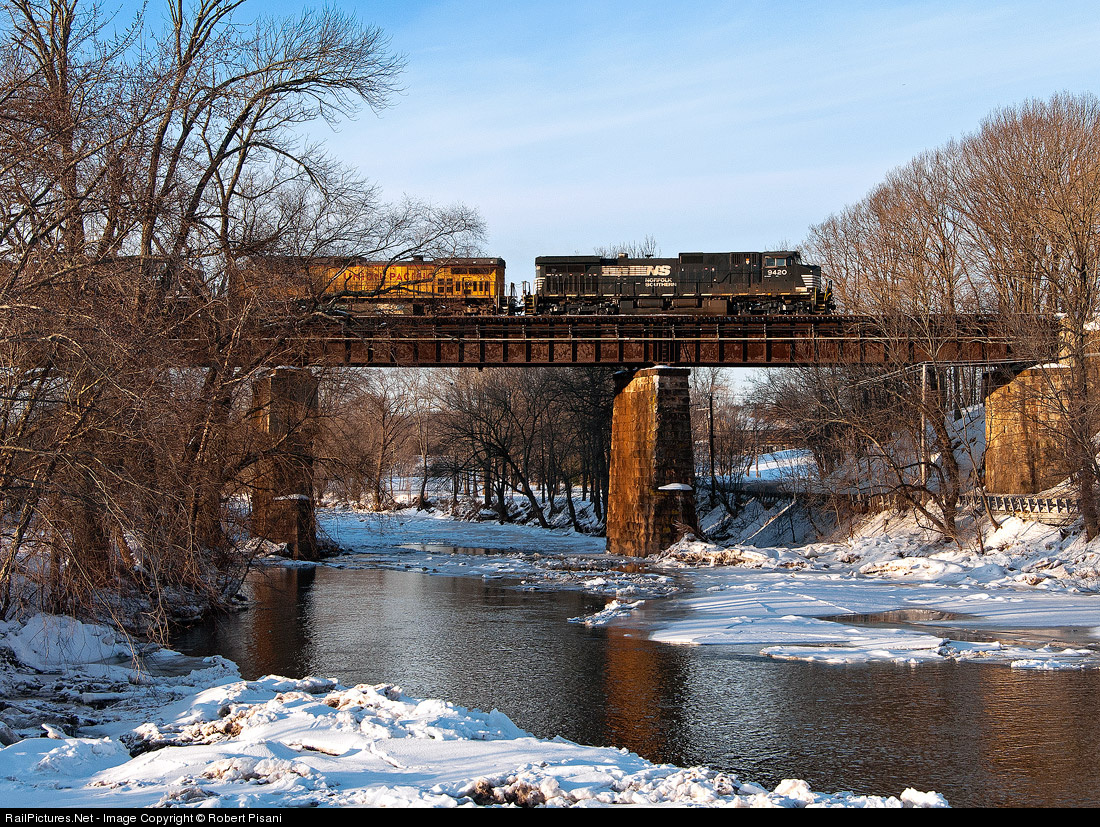 An eastbound NS intermodal train crosses the partially frozen South Branch of the Raritan River at Neshanic Station just before sunset on Presidents' Day. A trailing Union Pacific Dash 9 is obscured by the trees...just as well since it has been tagged with graffiti.