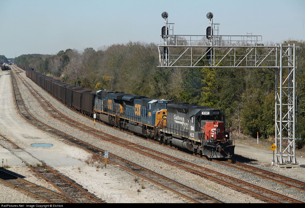 This must be one of the most awesome lash-ups of the year! An exceptionally rare ex-SP SD40-2, one of 12 CSX SD80MACs and an AC6000CW lead a loaded coal train past Moncrief yard.