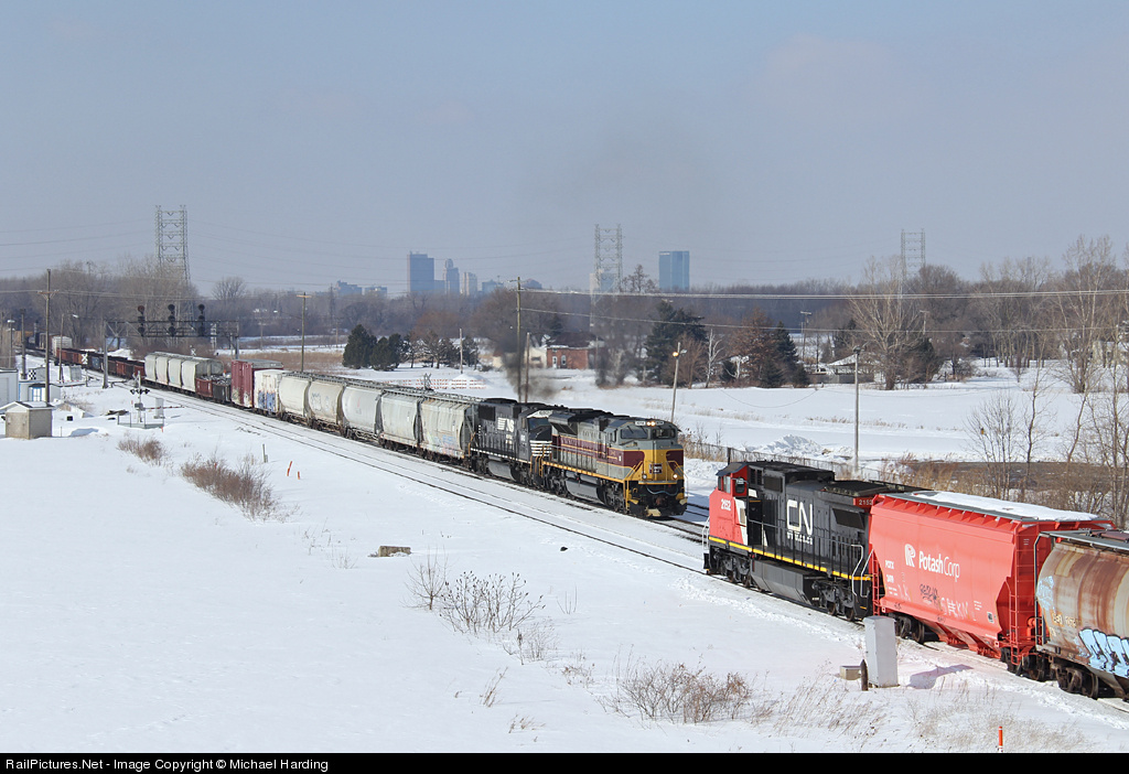 14Q passes a CN powered empty unit potash train waiting to go west in the controlled siding at Vickers.