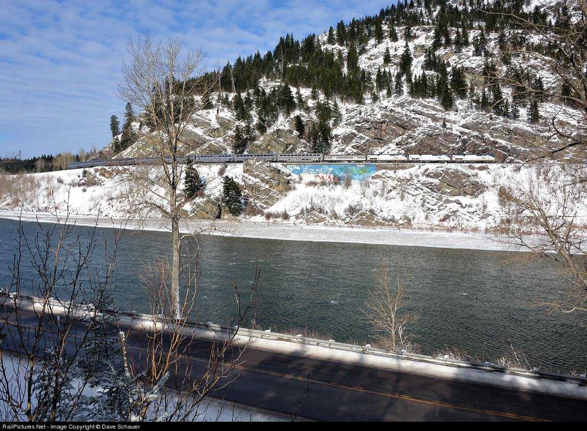 Normally it would be tough to get the eastbound Builder in light here during the short days of winter but the perpetually late No. 8 allows for a nice shot as it enters Bad Rock Canyon east of Columbia Falls. The Flathead River and U.S. Highway 2 share the canyon with BNSF here.