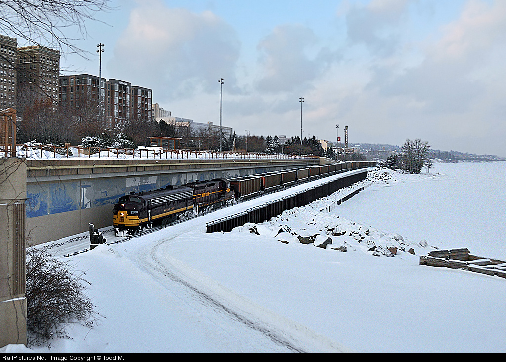 | The original FP7 demonstrator rolls down towards interchange with the BNSF as she teams with DMIR #316 to deliver coal cars back to the BNSF after being stored on the North Shore Scenic Railroad's line for the past several months. Here they are passing downtown Duluth, home to Fitgers Brewery, which is seen above the train with it's iconic red water tower and smokestack on the shore of Lake Superior. Demand for coal caused these cars to be pulled off and put back in service a little earlier than normal this year. |