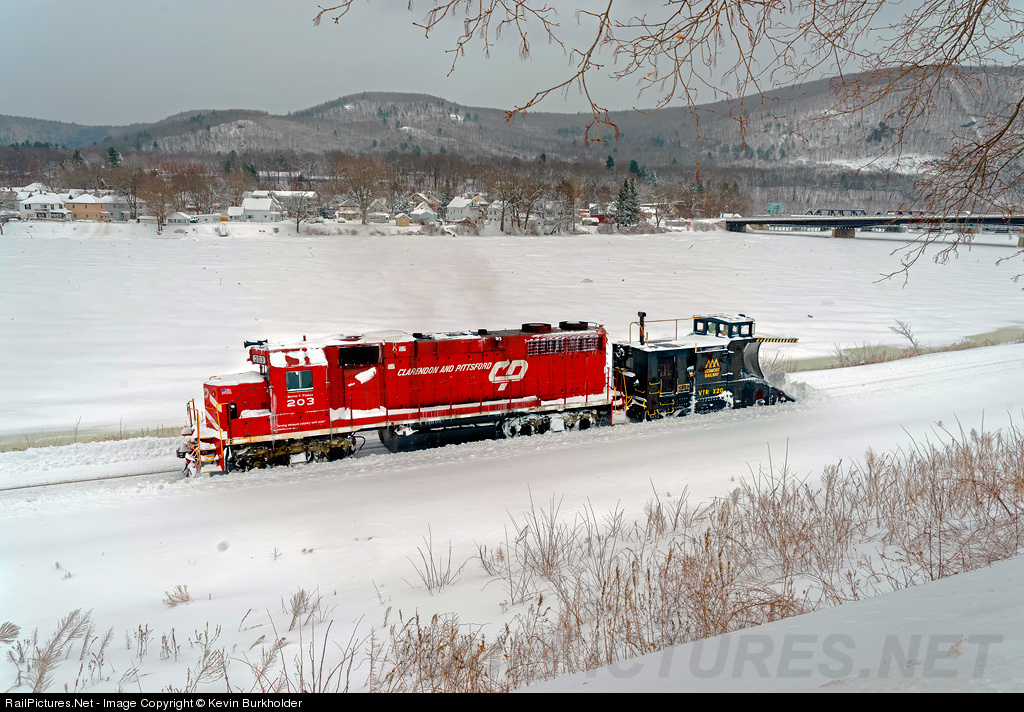 The Vermont Rail System's 101-year-old CP Angus Shops built plow is going strong on Valentine's Day as the CLP GP38 203 shoves the plow toward the Bellows Falls Diamond crossing with the New England Central and along a frozen and snow-covered Connecticut River. The town of Walpole, NH is located on the opposite side of the river.