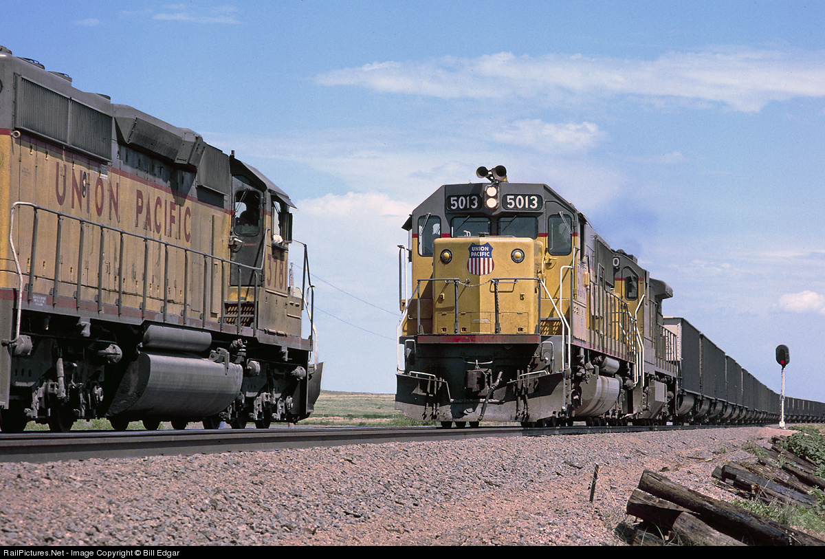 UP 5013, a Missouri Pacific lettered SD50 leading an empty coal train meets a loaded train headed by SD40-2 No. 3781 near Oshkosh, NE. This was in the early days of handling Powder River Basin coal for UP, and they were busy upgrading this line from North Platte to the CNW's new connection at Torrington, WY. Today 50-60 trains daily are loaded out of the Basin on UP, and an equal amount on BNSF.