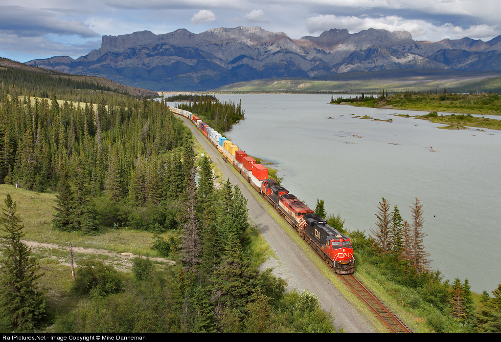 On July 19, 2011, Canadian National intermodal train No. 111 heads west at Windy Point, near Snaring, Alberta, along Jasper Lake in scenic Jasper National Park.
