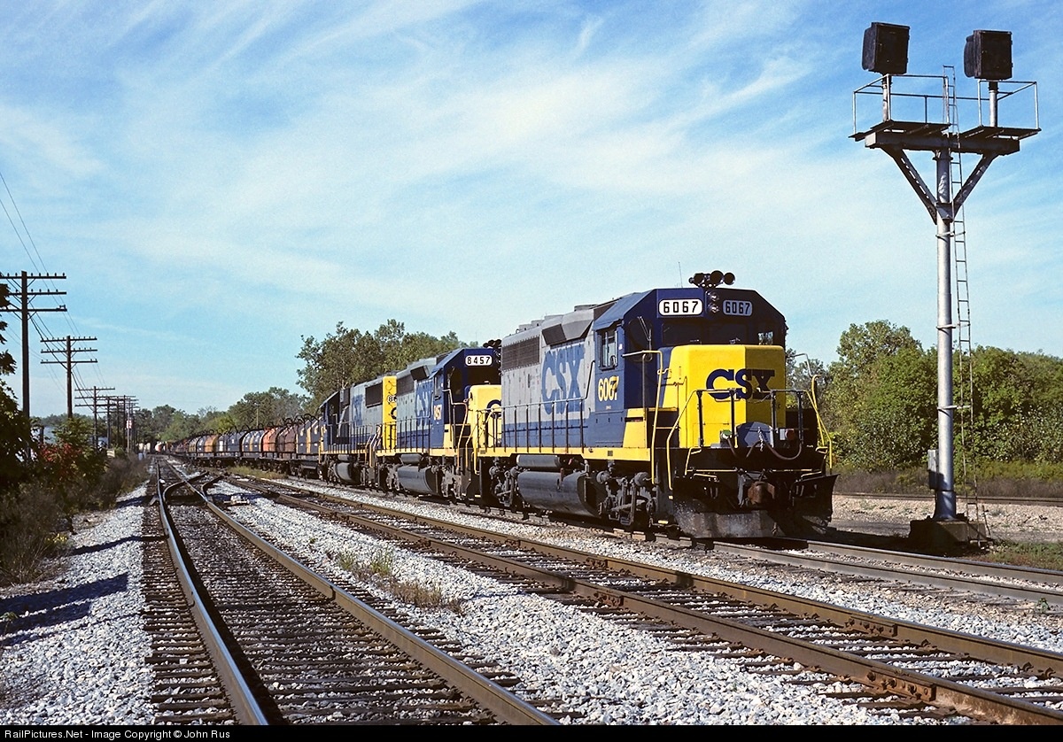 CSX train Q336 led by GP40-2 6067, SD40-2 8457 and SD50 8641 arrives at the west end of the Wyoming, MI yard. Passing the unusual signal (I was told it indicated which track to yard trains on before radios became common), the inbound train will be switched and re-crewed before continuing on east. Shown at a location known as Lamar, C&O and predecessor Pere Marquette once crossed the former Lake Shore & Michigan Southern RR's (later NYC, PC) Kalamazoo-Grand Rapids line near this point.