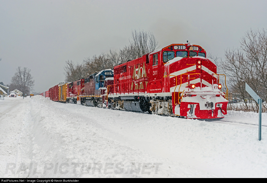 | Vermont Rail System train GMRC 263 is seen not long after the plow extra passed the same location east of downtown Chester. The train is led by both the pair of Vermont Railway GP40-2LWs 311 and 310 bracketing the VTR GP40-3 312 with steady snow still falling. |