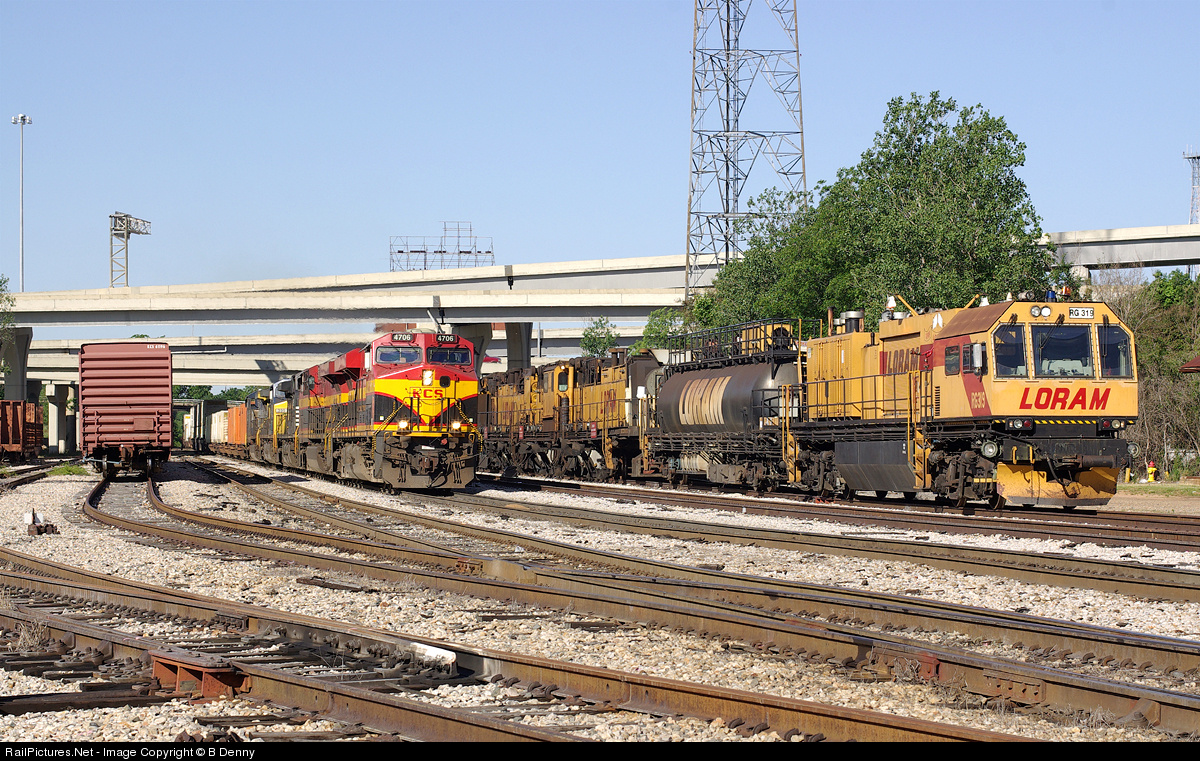 | A KCS stack train led by KCS 4708 passes a LORAM rail grinding train in Shreveport's KCS Depot Street yard. At this point in time, the yard was already doomed, as surveyors were working on platting out the new double track cut that replaced this yard. The LORAM rail grinding train was the last LORAM consist to tie up in the yard. |