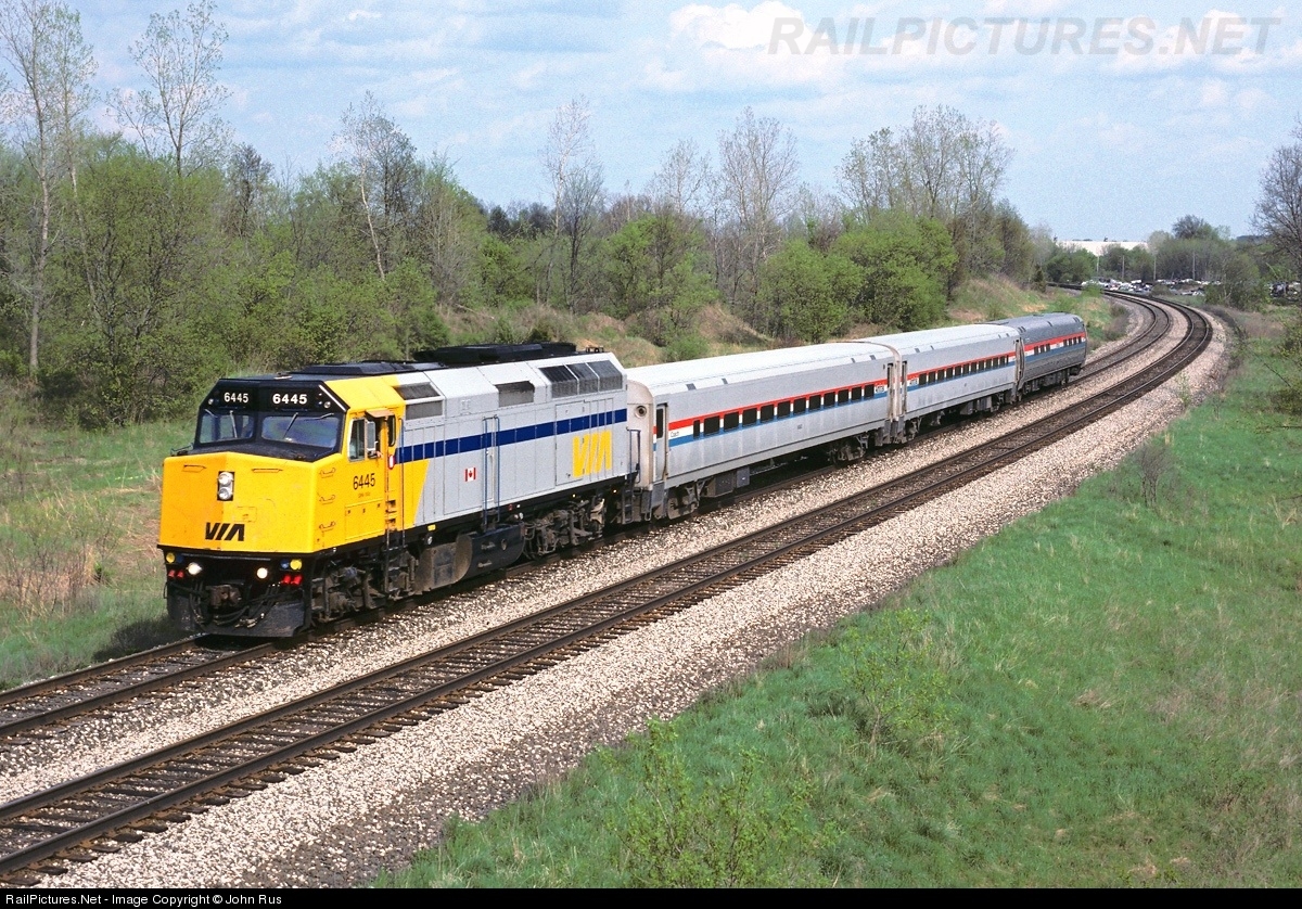 On it's westbound run to Chicago, Amtrak's train #365, the "International" passes the Ft. Custer State Park region of lower Michigan. Led by VIA F40PH 6445, the joint Amtrak/VIA train operated until April, 2004 before being cancelled due to declining ridership and replaced with the Port Huron-Chicago Blue Water.