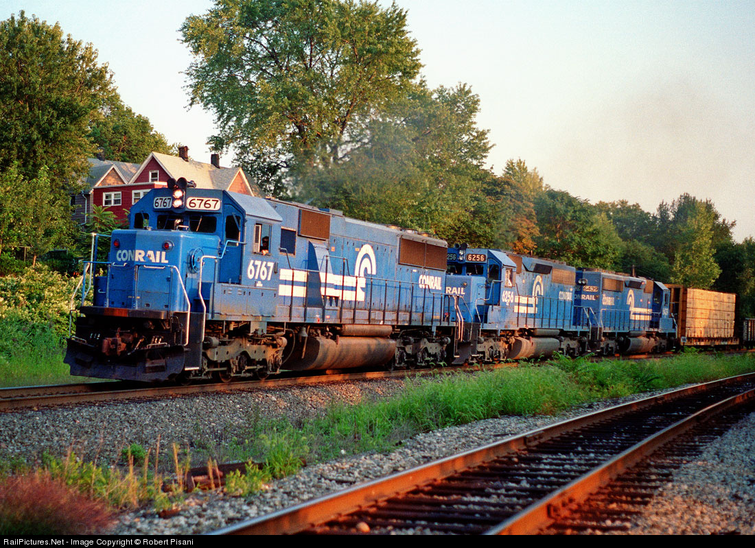 The last rays of sunlight illuminate the sides of three Conrail six-axle units in charge of ALSE (Allentown, PA - Selkirk, NY) as they round the curve on the approach to Ridgefield Park Station. The single track in the foreground belongs to the New York, Susquehanna & Western. At the time, both the NYS&W and Conrail were single tracked here. Today the River Line (now the CSX River Subdivision) has two main tracks through this area. The second unit in the consist is former Penn Central SD40 6256.