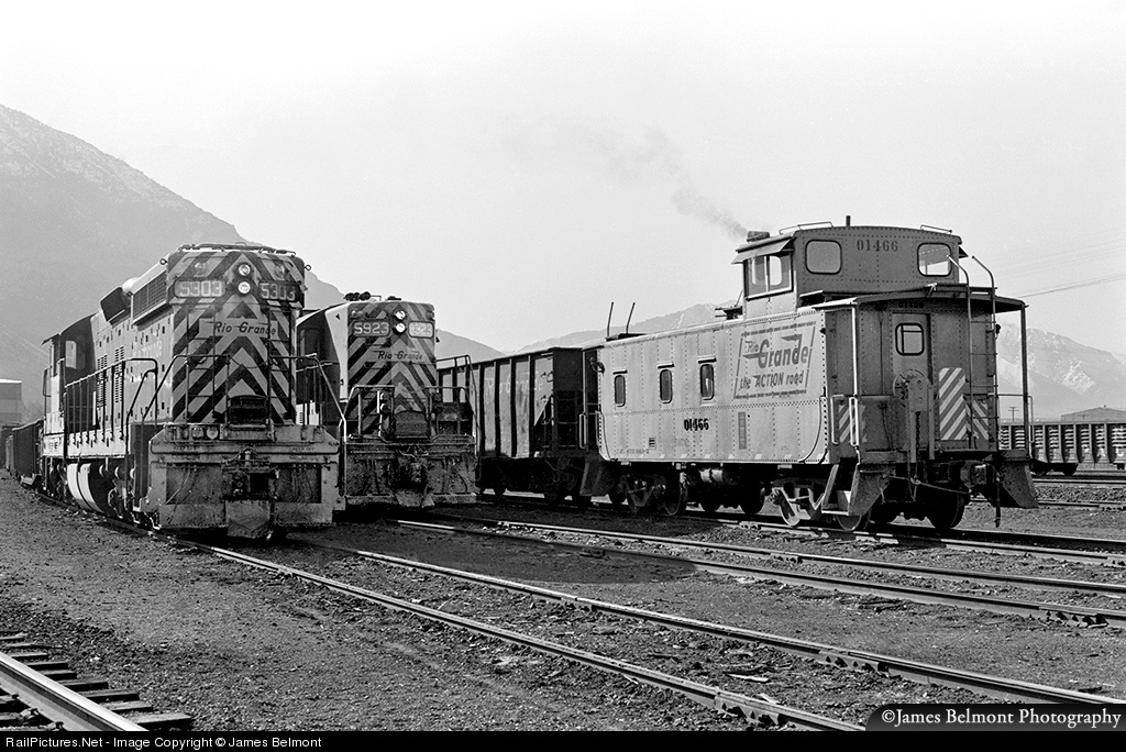 Rio Grande's Provo Yard hosted two trains per day in the 1970s. The Provo Switcher, with SD7 5303, will haul traffic between Provo and Geneva Steel while the Tintic Local, with GP9 5923, will work between Provo and Keigley on the Tintic Branch. Also present is caboose 01466, assigned to the Tintic complete with a coal fired stove.