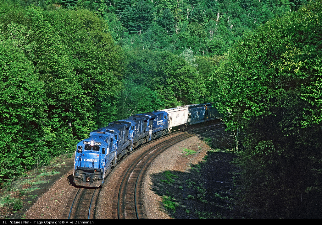Conrail’s first C36-7 No. 6620 leads a quartet of six-axle GEs past mile 128.5 on the former Boston and Albany line west of Chester, Massachusetts, on the afternoon of May 22, 1993.