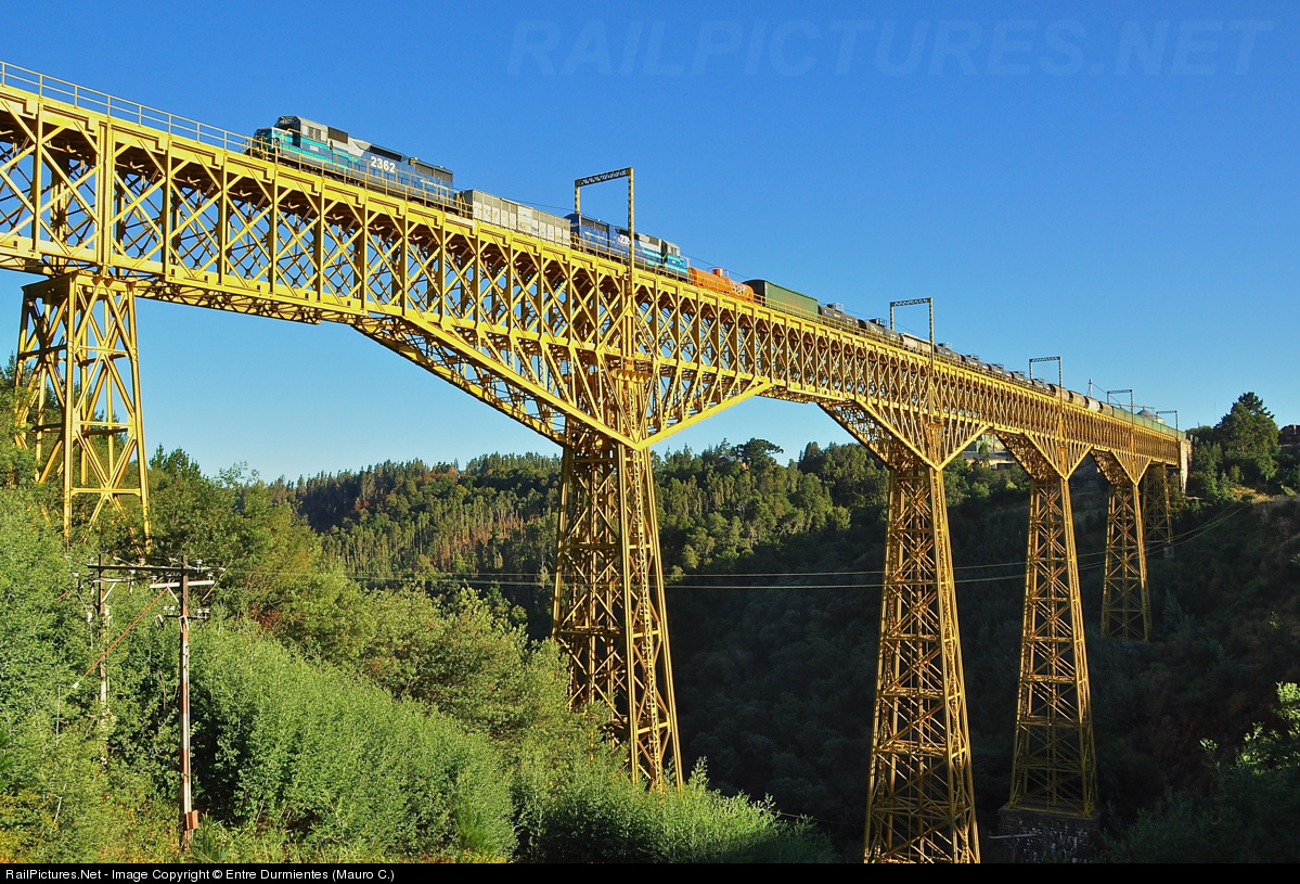 | A southbound FEPASA freight train, duo of EMD SD39-2M D-2362 and D-2356 locomotives drag a train #50.083 Talcahuano - Mariquina, and cross the great Malleco Viaduct at the beginning of the day (with its 103 meters high, 348 meters long and 123 years of life). |