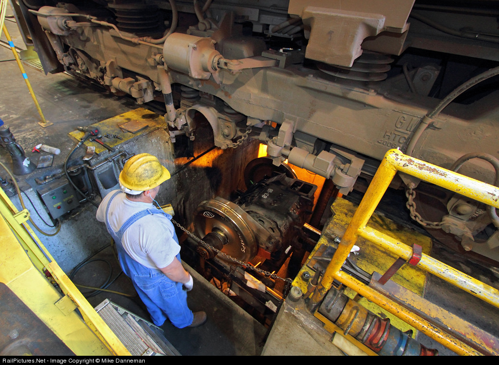 Union Pacific EMD SD70M No. 4831 is having its fifth wheel set/motor assembly replaced at UP’s Kansas City Locomotive Facility in K.C., Missouri, on October 21, 2013. After removing the old axle, a new wheel set/motor assembly is carefully raised with the drop table on the wheel track at the facility.