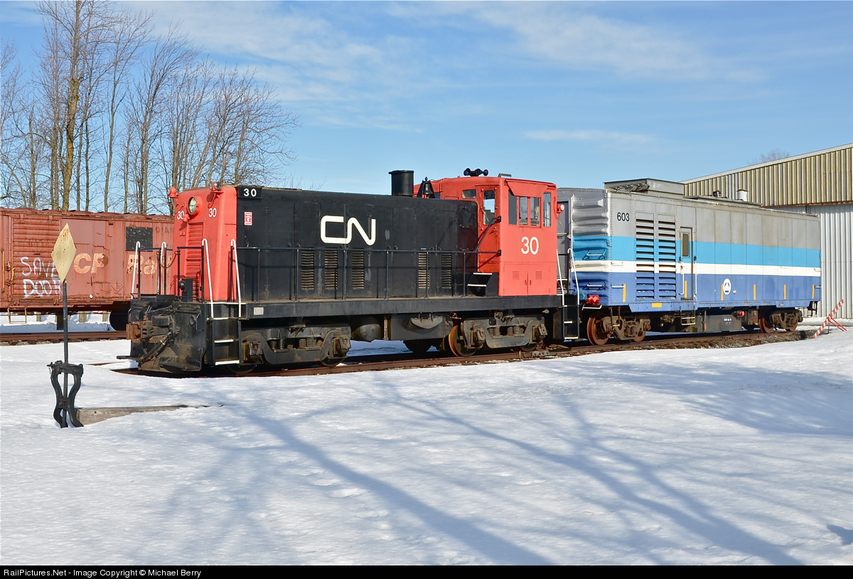 CN 30 and AMT 603 (generator car) slumber the winter away at Exporail. For more train photos, click