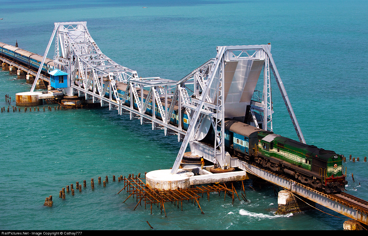 Today's noon "Rameswaram Express" (Train #16101) nineteen cars are hauled by WDM-3A GOC class loco ( Road #16499R) as it emerges ever so slowly out of the Pamban Bridge's cantilever section. Pamban Bridge became operational 24th Feburary, 1914 and completes 100 years of operation.