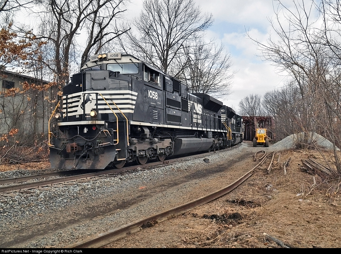 | After being trapped on the northern main, the trio of EMD SD70ACes (1058, 1060 and 1070) heads south with an empty coal train. NS 1070, the Wabash heritage unit was the leader when then train came north and it derailed several cars right at the trestle on March 7th in the snow as you can see the aftermath of part of the fixing. The derailment can be seen CLICK HERE and CLICK HERE |