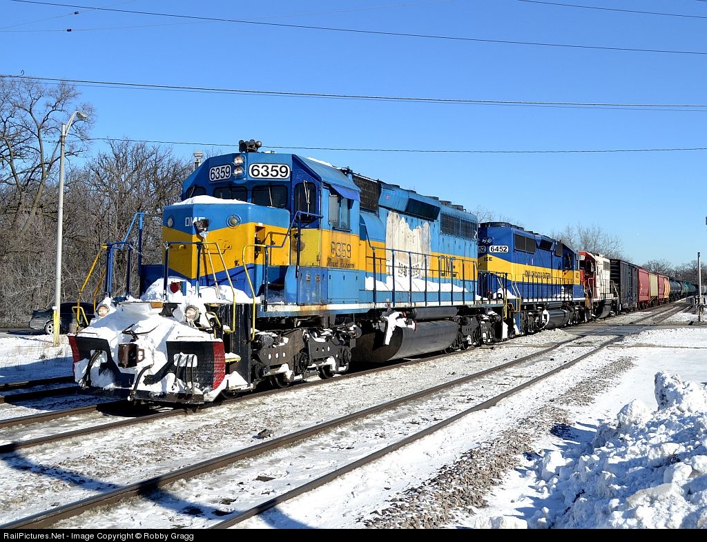 | DM&E SD40-2 6359, the Mount Rushmore unit, leads CP 289 west through River Grove. |