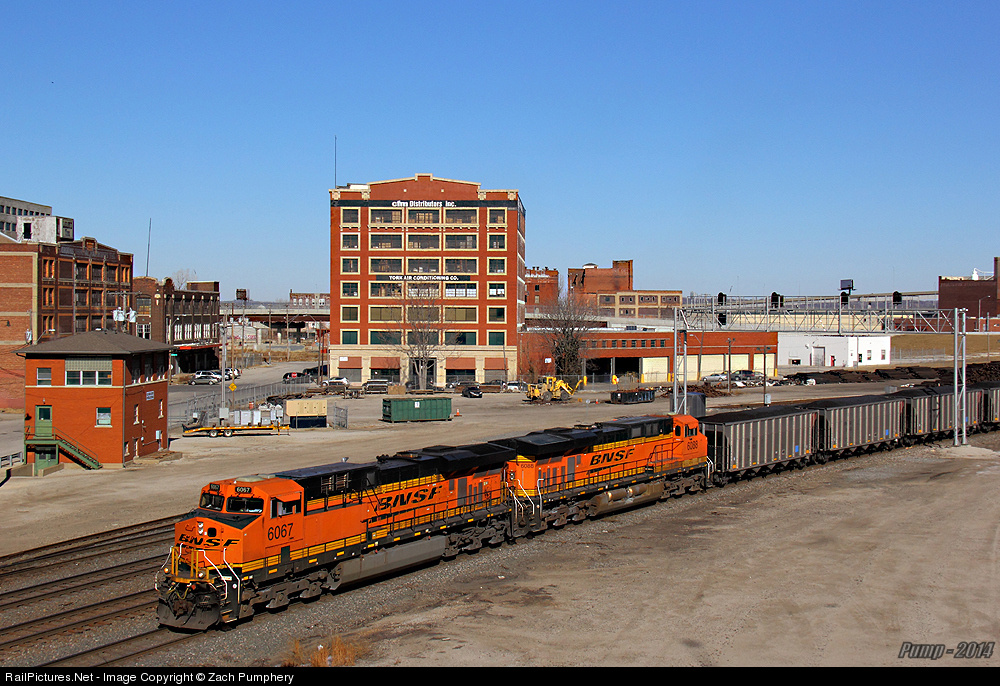 A pair of GEVOs take BNSF Train C BAMMHS0 07A down the KCT North-South Corridor in the West Bottoms past Tower 2, Old Union Depot Interlocking, as viewed from 12th Street. The KCT is home to 4 surviving interlocking towers. Tower 2, seen here, 4 at Santa Fe Jct., 8 at Sheffield, and 14 at Adams Street. All except Tower 14 are still used for railroad purposes, albeit none are still active interlocking towers.