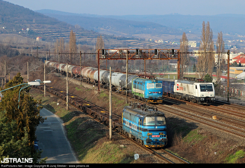 | I have been taking photos of trains for some years but this has never happened to me. While waiting for the white 189 of Express rail, suddenly 2 further trains pop up for a parallel run - 240.107 with a ČDC train and 242.543 from RTI. A nice birthday present!