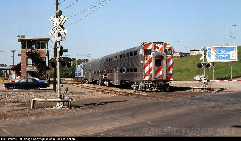 | A Regional Transit Authority (RTA) locomotive pulls a pair of bi-level coaches on the Rock Island line past the Vermont Street interlocking tower. Tom Golden photo. |