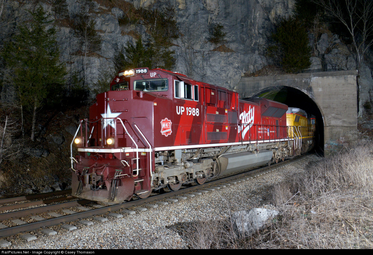 | Union Pacific's "Katy" heritage unit leads train K42123 out of the tunnel at Sinks, KY, nearing Corbin. |