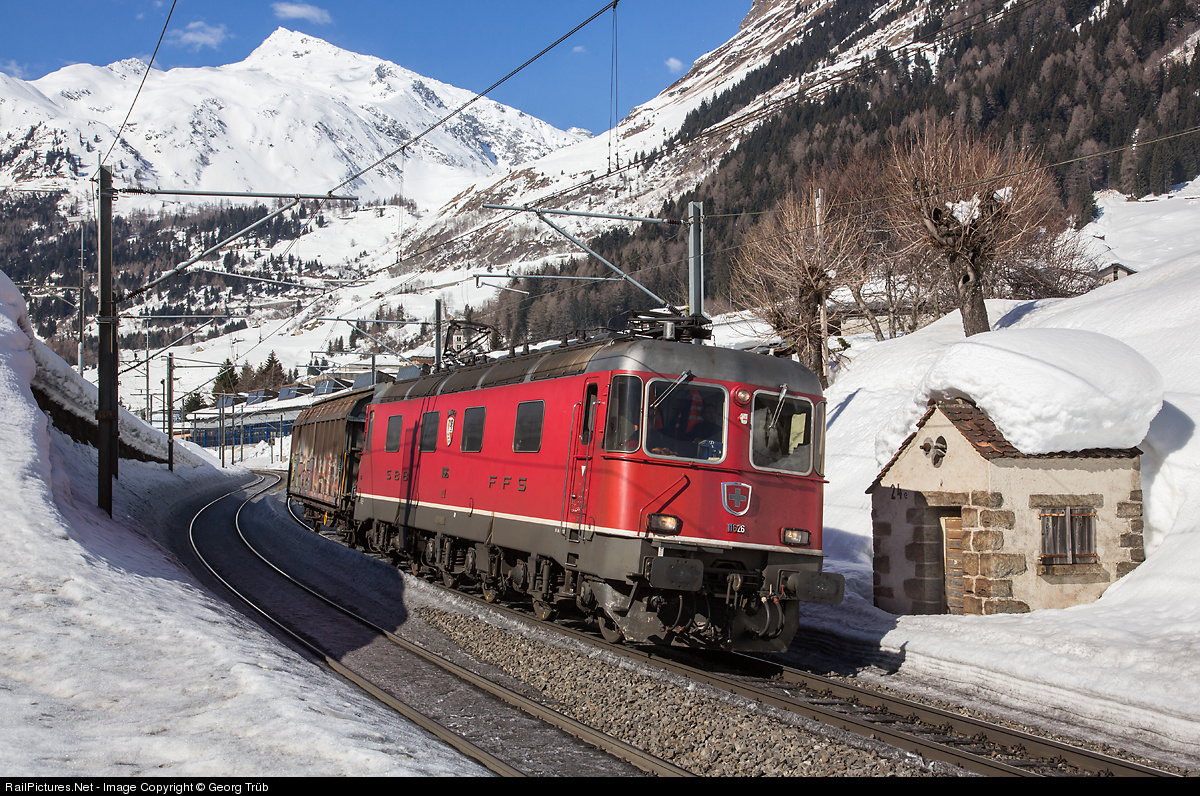 | 10600 HP for one freight car down the 2.6 % grade of the Gotthard south ramp. Re 6/6 # 11626 "Zollikofen" is leaving Airolo with the local freight train down to Bellinzona, passing a typical Gotthard railway lineman hut "24e". |
