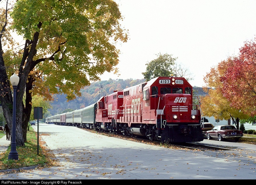 SOO's expermental Cat powered locomotive 4103 heads north through Bellevue, Iowa, on a fine October day. Bellevue is famous for street running, one time MILW line from Sabula/Savanna to Dubuque.
