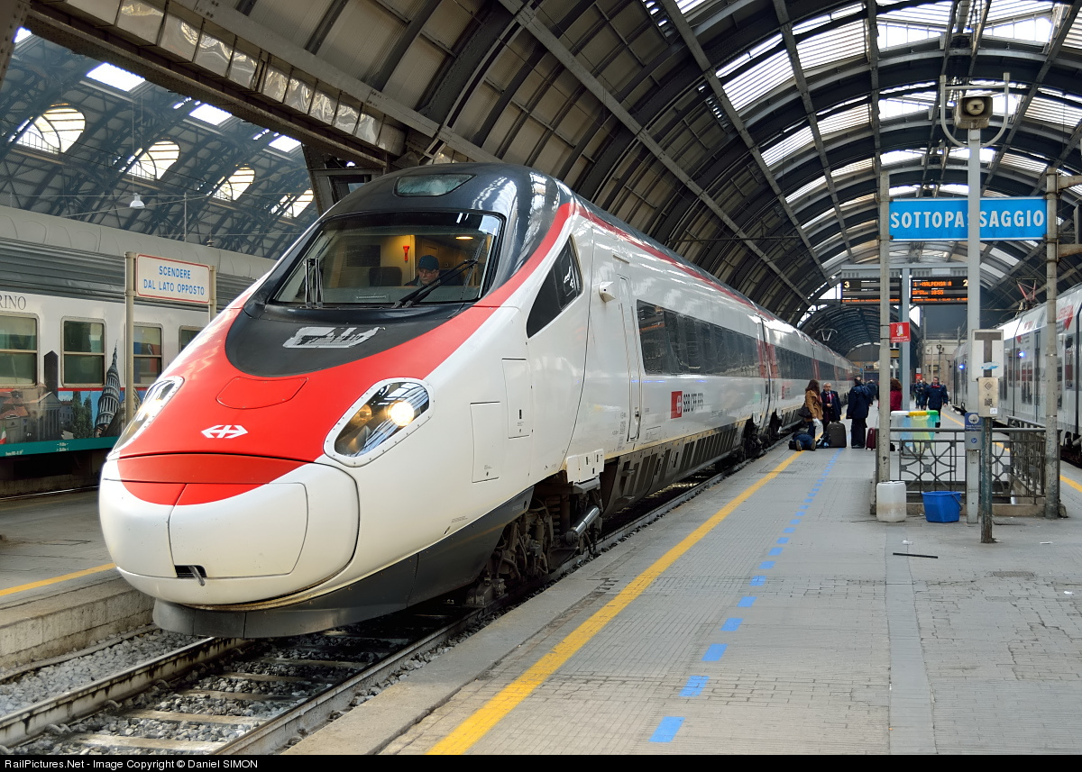 | A SBB high-speed tilting train from the ETR 610 class is about to leave the Milano Centrale station for Basel in Switzerland. These beautiful trains have been designed by Giorgio Giugiaro and have been produced by ALSTOM in the Savigliano facility in Italy. |