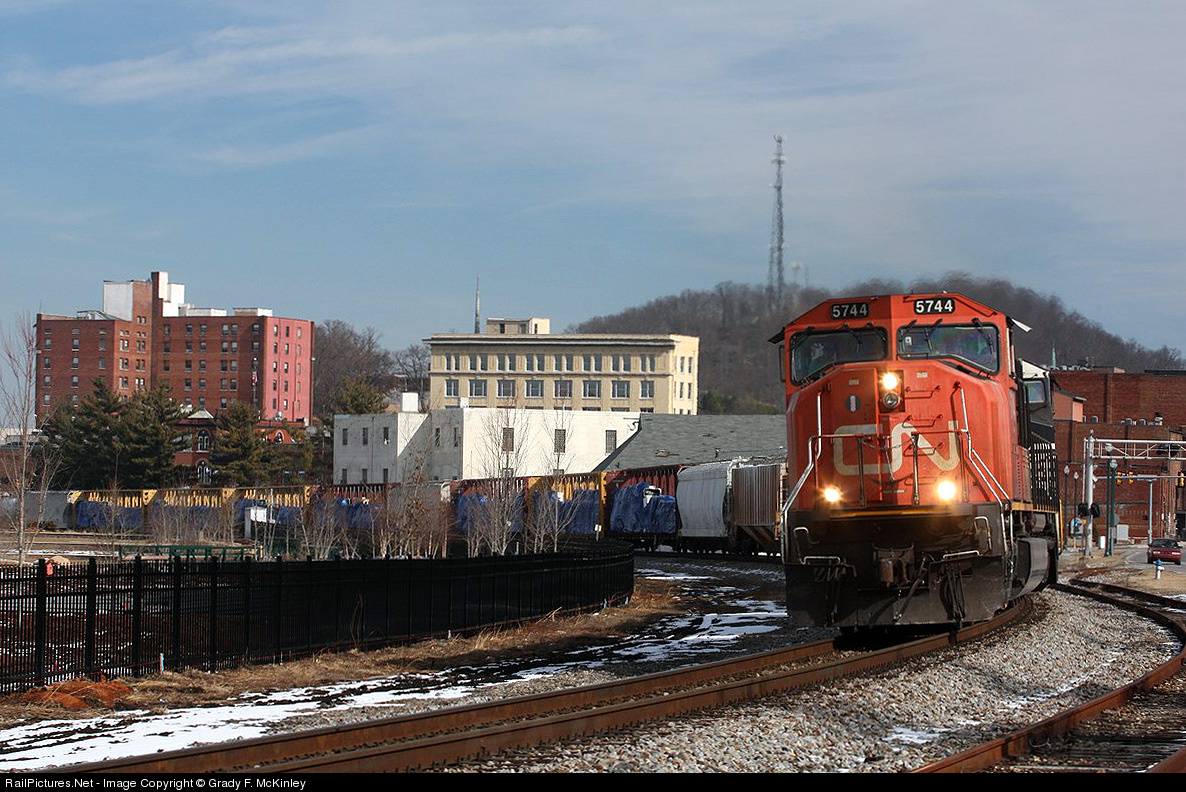 | Canadian National #5744 curves through downtown Johnson City, TN on this last day of January 2014. Special thanks to RP.net contributor Samuel Phillips for keeping me updated on the progress of this train. |