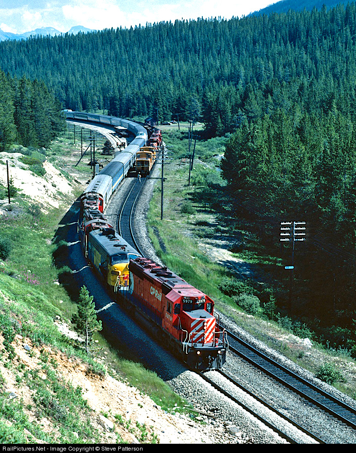 CP SD40 5979 is on the point of VIA’s westbound 15-car Train 1 after helping it up grade from Calgary to Stephen, B.C. where the train is now at M.P. 123 and about to plunge down Kicking Horse Pass through CP’s famous spiral tunnels. It has met an eastbound freight which has three helpers on the rear and mysteriously two cabooses coupled behind an empty flat car. The caboose crew gives No. 1 a roll-by inspection on Aug. 13, 1981.
