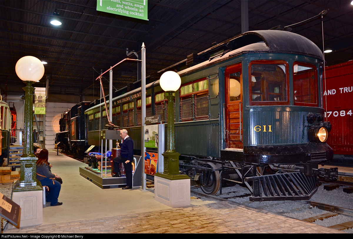 | Teaching about trolleys. An Exporail volunteer demonstrates how a trolley operates, with a preserved example behind him. MSC 611 was built by Ottawa Car in 1917 for the Montreal & Southern Counties, an interurban which operated between Montreal and Granby on the south shore of the St-Lawrence river. For more train photos, click here.