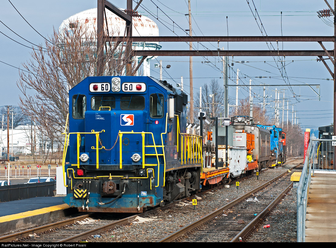 SEPTA's wire train spends the weekend in the yard adjacent to Lansdale Station. The various locomotives in the distance belong to local shortline Pennsylvania Northeastern. SPAX 60 wears the unofficial nickname "The Carmel Cannonball" in small lettering on the low nose. This is a reference to SEPTA's Carmel Interlocking where the unit has probably spent an inordinate amount of time in one place, not behaving like a typical "Cannonball".