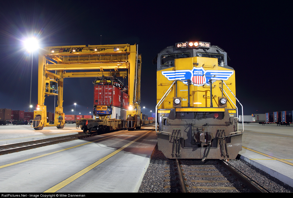 Loading and unloading containers on/off trains is a 24 hour/7 days a week job at Union Pacific’s Joliet Intermodal Terminal (also known as Global IV) at Joliet, Illinois, as seen on the night of November 10, 2010.