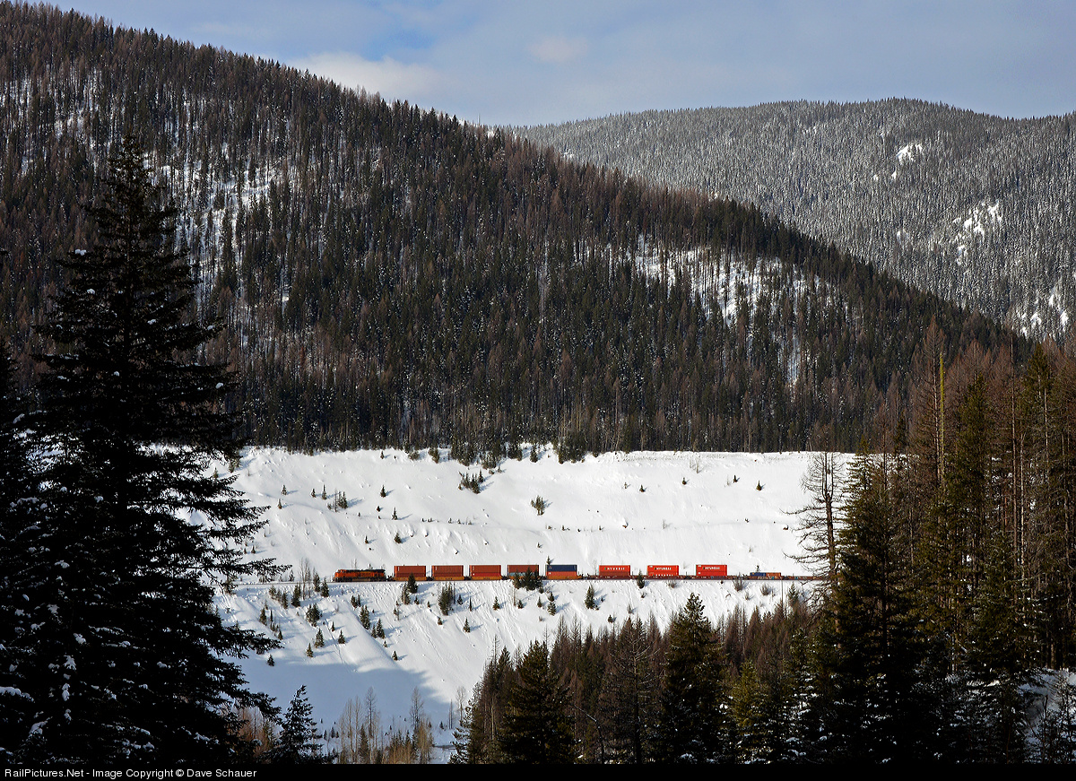 | A stack train provides a nice splash of color as it eases along the single track east of Essex near Java on Marias Pass. Heavy snow in this area has caused issues this winter with an avalanche recently closing the line east of here. |