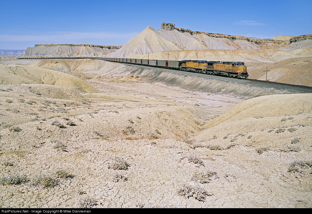 An eastbound Union Pacific coal train passes through striking desert landscape just west of Floy, Utah, on March 16, 2009. In the foreground, small desert plants struggle to survive in such a low-moisture, harsh environment and alkaline soils. For a view of what the trains look like from the stark tan peak above the train in the middle of the photo see: www.railpictures.net/viewphoto.php?id=425690 and www.railpictures.net/viewphoto.php?id=411996