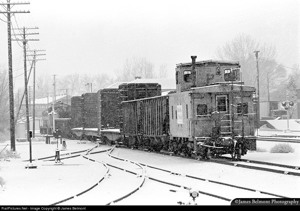 | With a TR5 'cow and calf' for power, UP's Geneva Turn departs Provo on a snowy Nov. 27, 1975 morning. |
