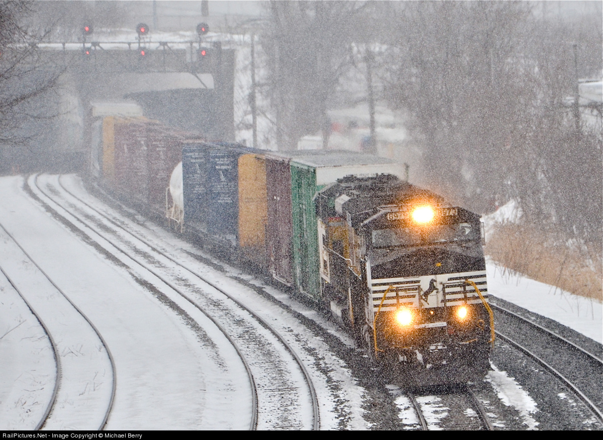 High headlight. Normally a nocturnal train, CN 529 is passing through Montreal West during the middle of a snowy afternoon with NS 8979 and UP 8353. While power on this train was usually exclusively NS up until recently, there has been an influx of UP power the last couple of months on this train. Until it is interchanged to CN at Rouses Point NY, this train is known as CP 931. The leader has a high headlight, as do most NS units. This is rare in Canada where nose-mounted headlights are the norm. For more train photos, click here.