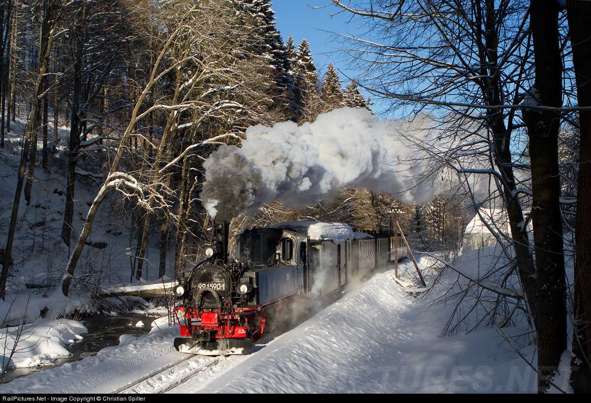 Between Joehstadt and Steinbach in the ore mountains is a lovely narrow-gauge museum railway called "Pressnitztalbahn". The museum railway is actually driving in winter between Christmas and New Year's trains. On the way back from Steinbach steams 99 1590-1 through the high trees in the winter forrest.