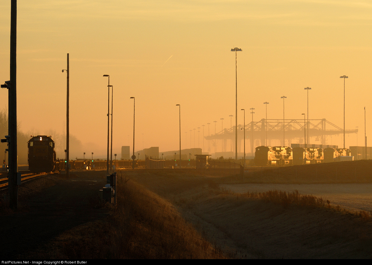 Sunrise catches CSXT 8421 moving an empty string of container cars through a light fog outside the container facility.